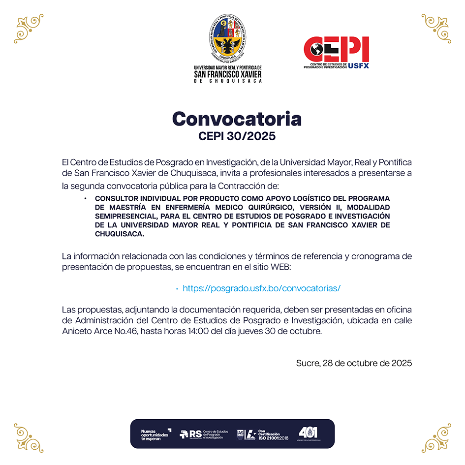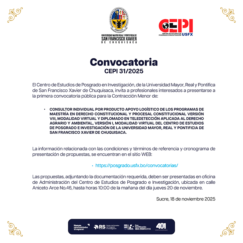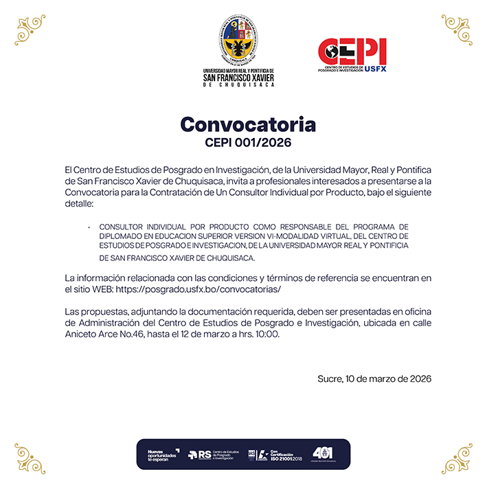 CONSULTOR INDIVIDUAL POR PRODUCTO COMO APOYO LOGÍSTICO DEL PROGRAMA DE MAESTRÍA EN EDUCACIÓN SUPERIOR CON CERTIFICACIÓN INTERMEDIA EN DIPLOMADO EN GESTIÓN Y PRODUCCIÓN ACADÉMICA VERSIÓN XIX – MODALIDAD VIRTUAL, DEL CENTRO DE ESTUDIOS DE POSGRADO E INVESTIGACIÓN DE LA UNIVERSIDAD MAYOR REAL Y PONTIFICIA DE SAN FRANCISCO XAVIER DE CHUQUISACA